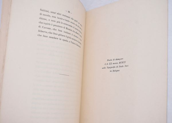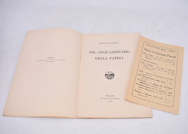 Prima edizione del Pamphlet con il “Discorso pronunziato nell’aula magna dell’Università di Bologna il 9 gennaio 1911”. Si conserva, all’interno, un catalogo editoriale Zanichelli delle opere di Giovanni Pascoli.