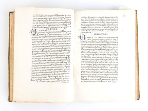 Prima edizione delle Vite dei Papi di Bartolomeo Platina, dalla biblioteca di Joseph Smith console a Venezia con presente il suo ex libris. Platina è stato un umanista e gastronomo italiano. Dopo aver studiato a Firenze, ottenne un posto nella cancelleria pontificia sotto il noto umanista Papa Pio II. Licenziato da questa posizione dall'antiumanista Papa Paolo II, alla fine trovò le sue fortune ripristinate quando il fortemente filoumanista Papa Sisto IV lo nominò alla posizione di bibliotecario vaticano. Le sue Vite dei Papi, scritte su richiesta di Sisto IV, furono la prima opera a presentare sistematicamente la storia del papato dai tempi di San Pietro fino al regno di Paolo II, dando spazio anche alla storia romana e ai temi dell'antichità. Platina è noto anche come autore del De onesta voluntate et valetudine, il primo libro di cucina stampato, che ebbe numerose edizioni.