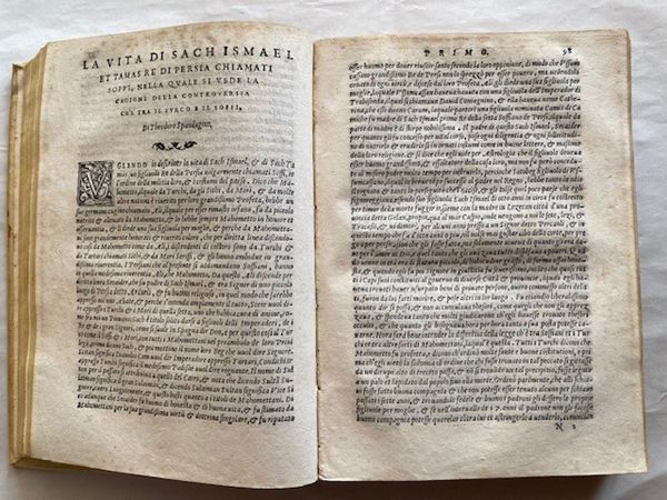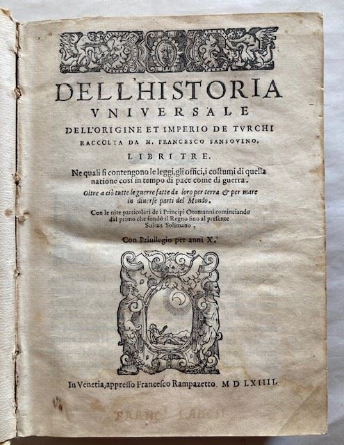 SANSOVINO FRANCESCO. Dell'historia universale dell'origine et imperio de Turchi raccolta da m. Francesco Sansovino. Libri tre. Ne quali si contengono le leggi, gli offici, i costumi di quella natione così in tempo di pace come di guerra ... Con le vite particolari de i principi Ottomanni cominciando dal primo che fondò il Regno sino al presente sultan Solimano. Con Privilegio per anni X. Venice: (Francesco Sansovino editor): appresso Francesco Rampazetto, 1564.