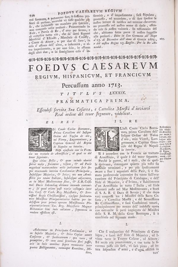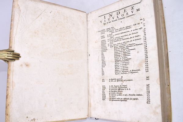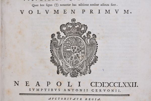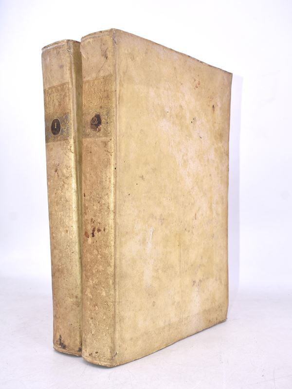 2 volumi In Folio 375x250 mm. pp. XVI, 632 ; [2], 632 mancante il front. del secondo vol., con stemma araldico al frontespizio del primo volume, testo stampato su 2 col. Solo i primi due volumi dei 4 che compongono l’opera. Legatura coeva in piena pergamena, titoli in oro al dorso.