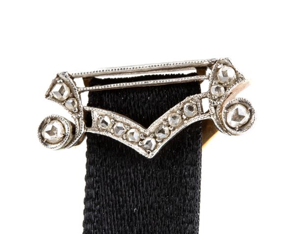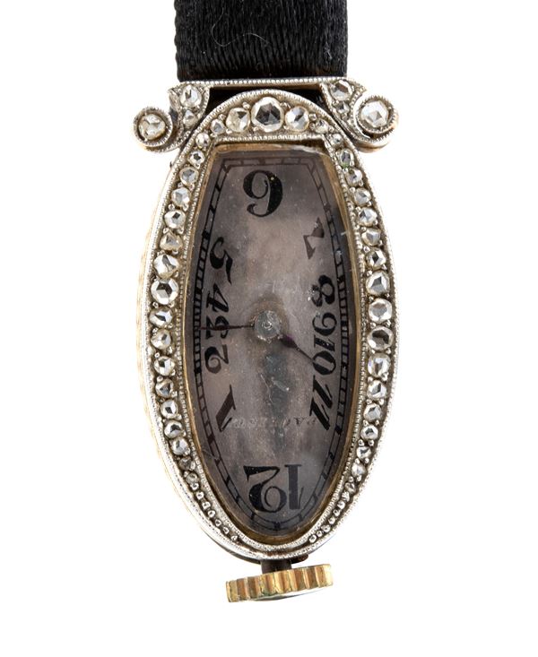 orologio di forma ovale con contorno di diamanti tagliati a rosa dell'inizio del XX secolo con nastro e spilla per indossarlo sul bavero.