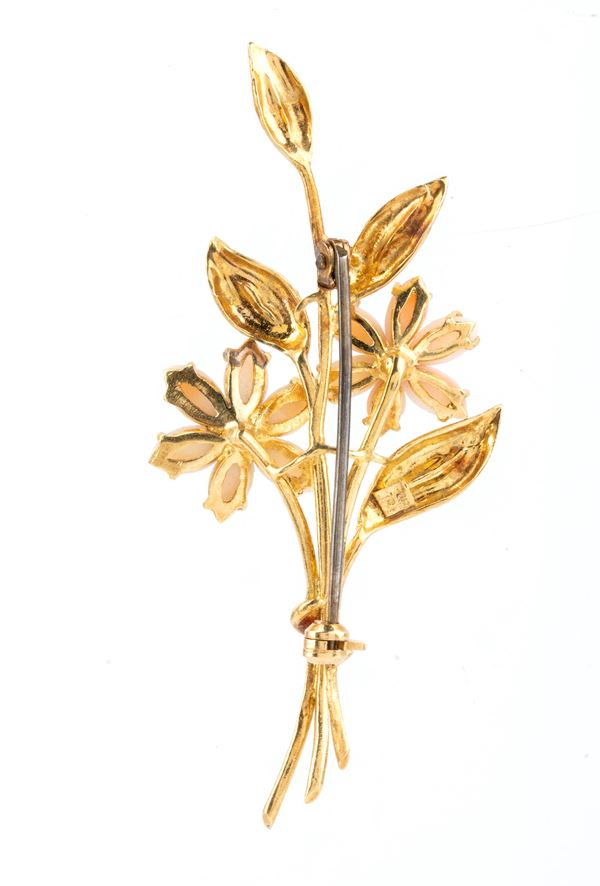 Spilla floreale in oro con smeraldi e corallo rosa