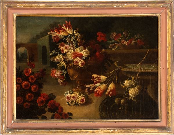 Questa ricca esposizione floreale en plein air presenta i caratteri tipici della natura morta napoletana della prima metà del Settecento. Questa specifica tipologia, sulla scorta di Andrea Belvedere, godette in effetti di particolare fortuna nel mercato artistico partenopeo, grazie a specialisti come Gaspare Lopez, Nicola Casissa e Francesco Lavagna, le cui poche opere certe mostrano particolari similitudini con quella che qui si presenta.