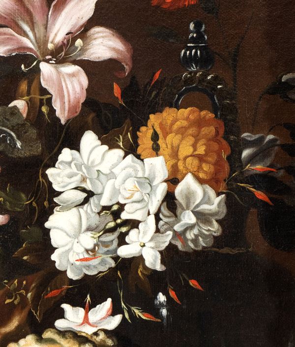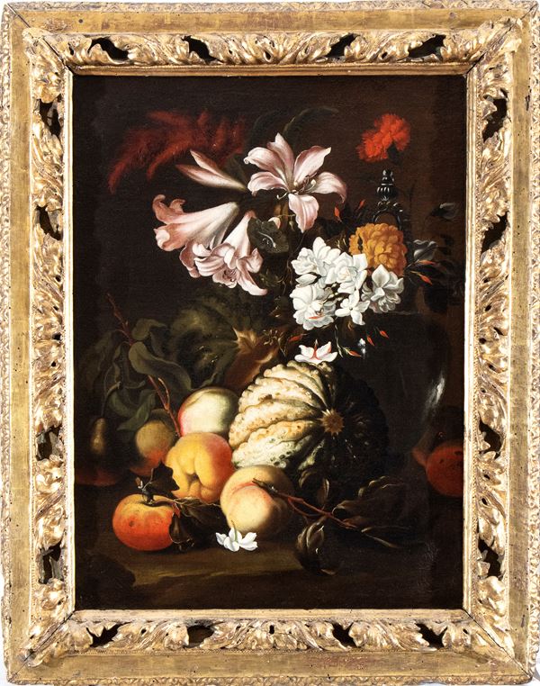Questa brillante composizione, straripante di fiori e frutta eppure rigorosamente calibrata, va ricondotta al periodo romano di Abraham Brueghel, presumibilmente nel settimo decennio del Seicento. La tela testimonia efficacemente il fertile influsso sul pittore dei modelli di Michelangelo Pace da Campidoglio e Michelangelo Cerquozzi a questa altezza cronologica già sapientemente metabolizzati. La vivacità e varietà dell'impaginazione, già pienamente barocca, combina felicemente alcuni dei motivi più ricorrenti della pittura di Brueghel, in particolare i sontuosi gigli rosati, i gelsomini e la zucca. Un composizione assai simile, salvo che per minime varianti, è stata recentemente esitata presso Christie's New York (20 Ottobre 2020, l. 75).