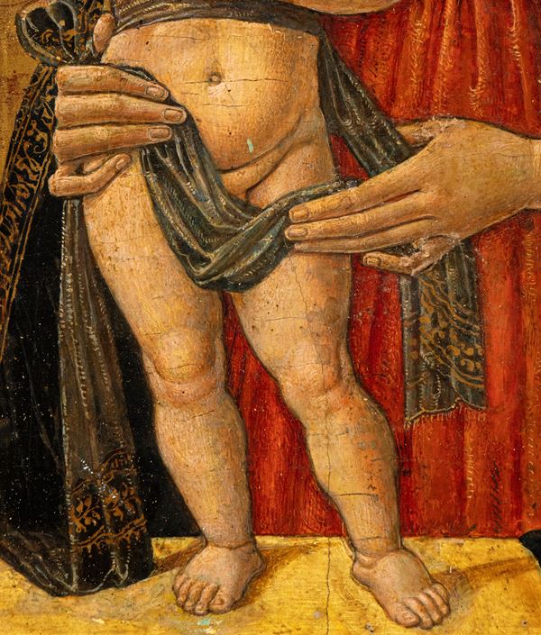 Il dipinto deriva da quello in tutto simile che si conserva presso il Museo di San Marco a Firenze, la cui attribuzione, dopo essere a lungo oscillata fra Fiorenzo di Lorenzo, Antoniazzo Romano e Pier Matteo d'Amelia, appare oggi definitivamente indirizzata in favore di quest'ultimo.