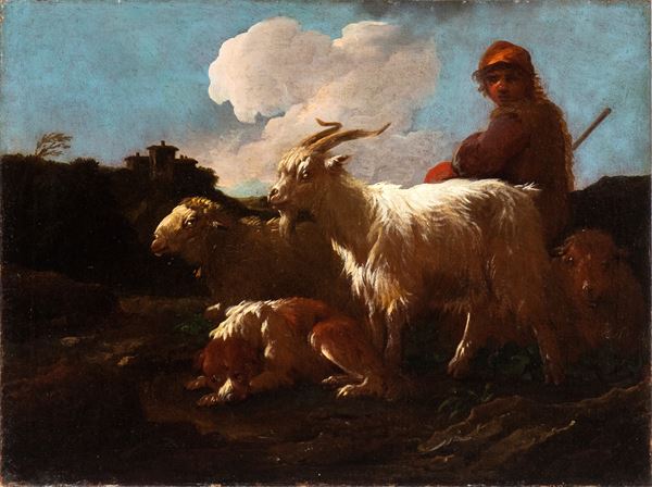 a) Pastorella con capre e cane; b) pastore con capre e cane. Coppia di dipinti