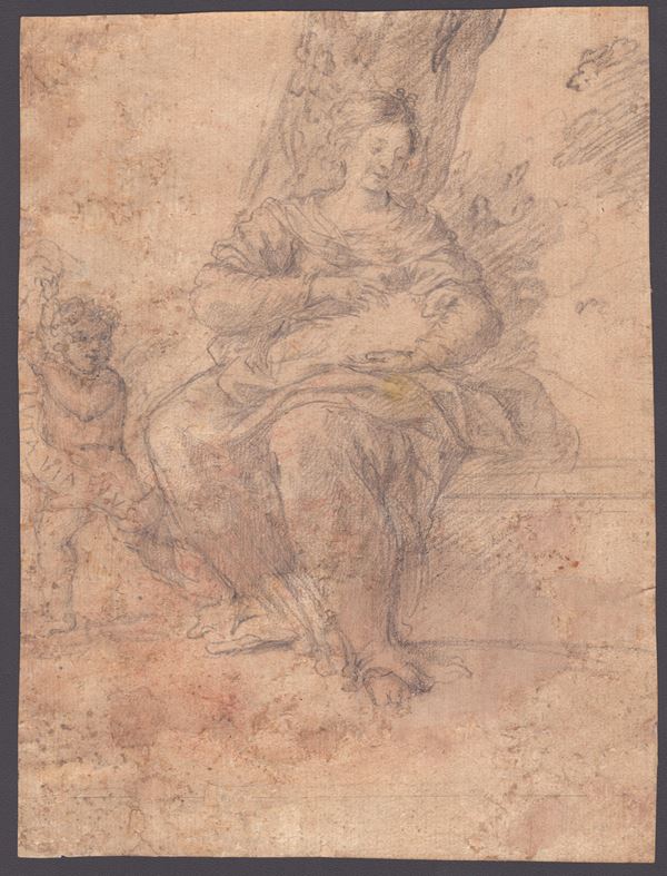 Due disegni sul fronte e sul retro della carta vergata con un frammento di filigrana. Sanguigna e matita nera. 231 x 174 mm