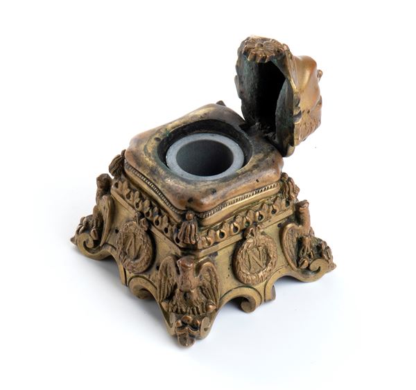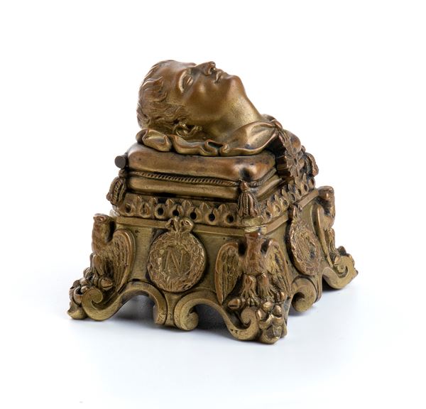 Calamaio in bronzo con maschera funebre di Napoleone, metà XIX