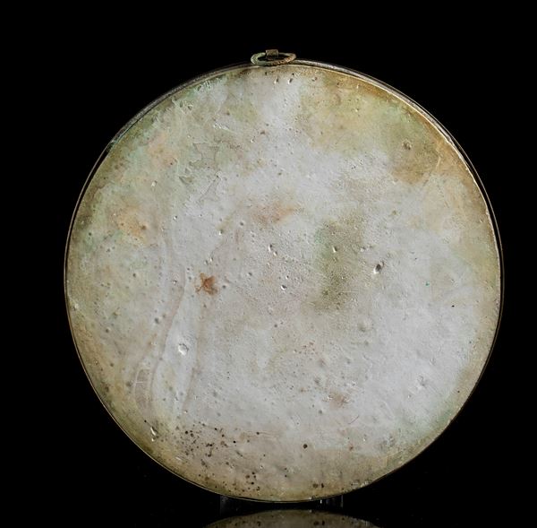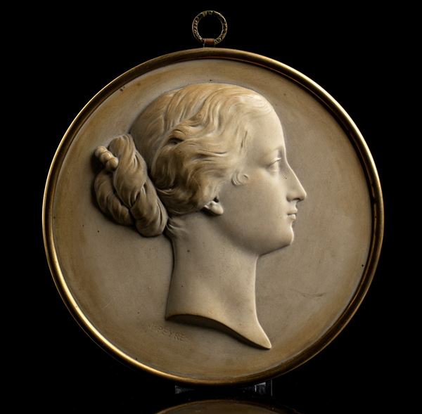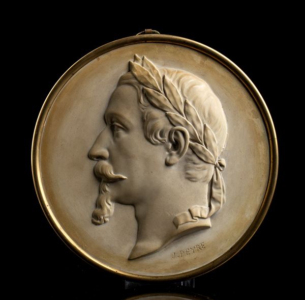 coppia di miniature in biscuit e cornice in bronzo dorato raffiguranti Napoleone III e l’imperatrice Eugenia, firmate J. Peyre, seconda metà del XIX