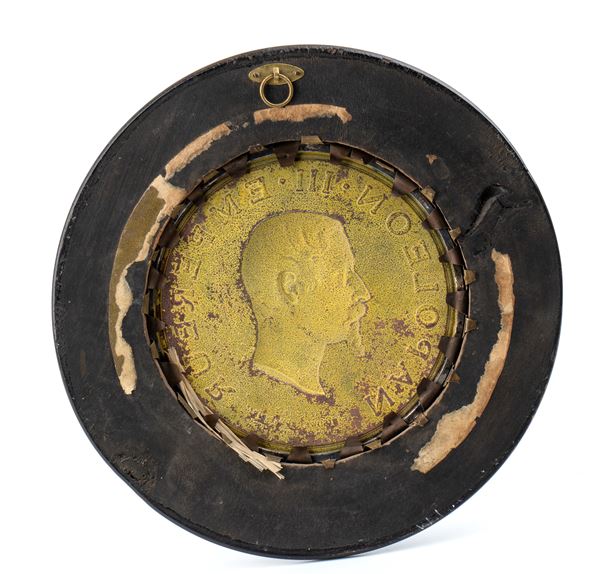 miniatura in bronzo argentato di Napoleone III con cornice in legno coeva, fine XIX