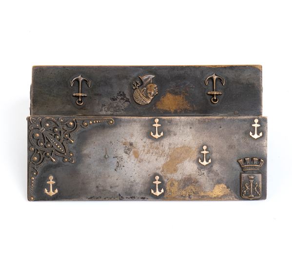 Piccolo contenitore in bronzo argentato con decorazione di ancore, testa di moro e stemma della città di Ajaccio