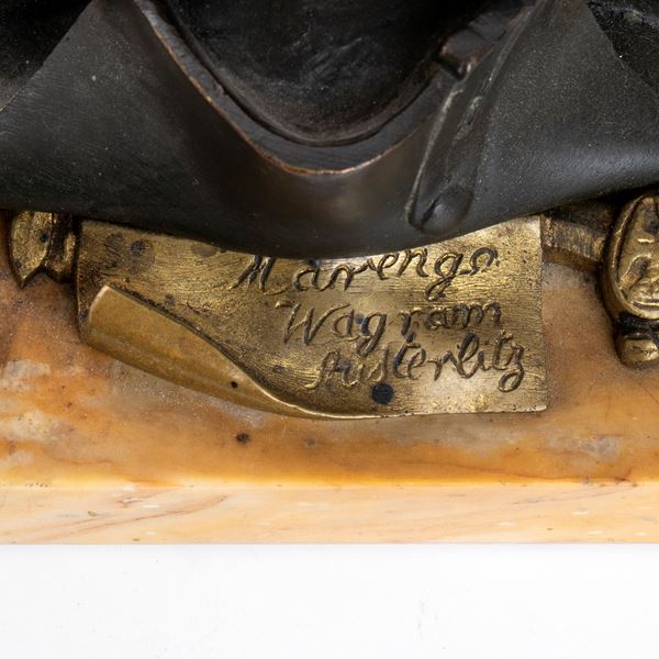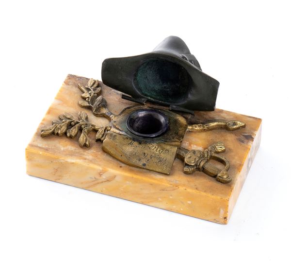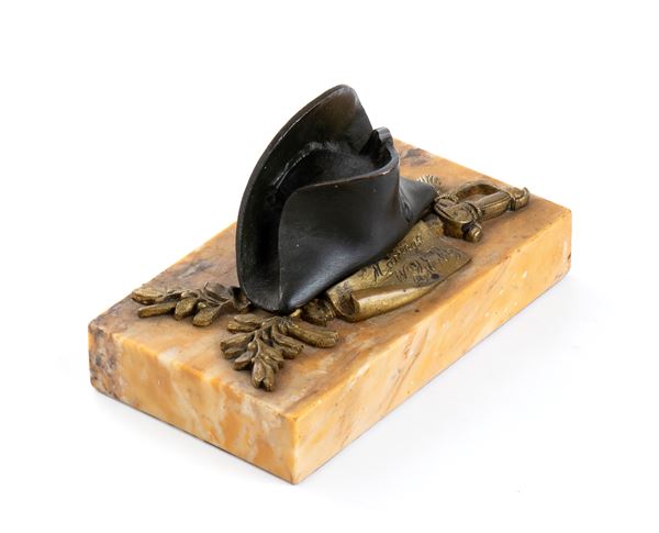 Presse papier in bronzo e marmo giallo con cappello di Napoleone e trofeo d’armi