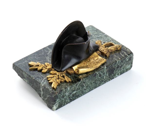 presse papier in bronzo e marmo verde con cappello di Napoleone e trofeo d’armi