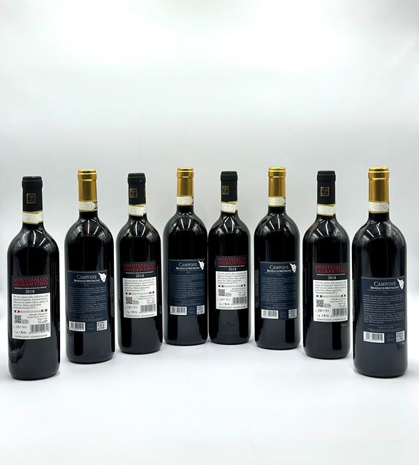 Selezione Brunello di Montalcino DOCG - 8 bottiglie (bt), annate 2018.Livello : entro il collo (WN).Condition report : etichetta e capsula in perfette condizioni.