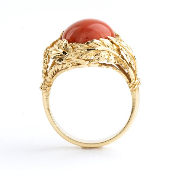 incastonato con cabochon di corallo Mediterraneo (corallium rubrum) contornato da motivo di foglie.