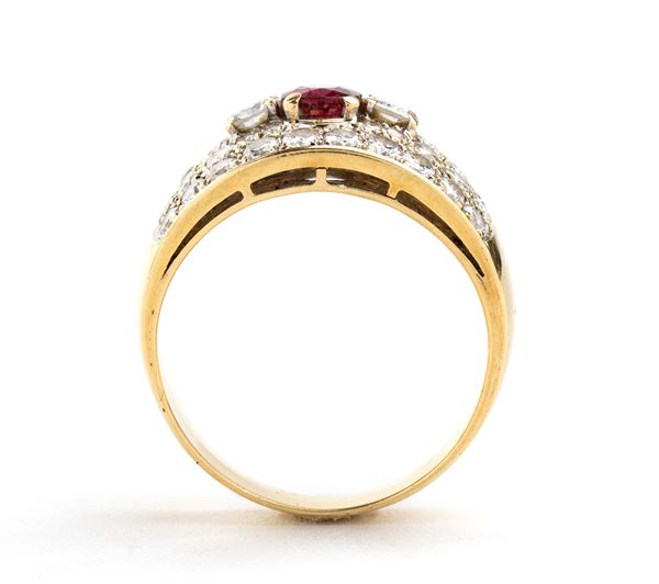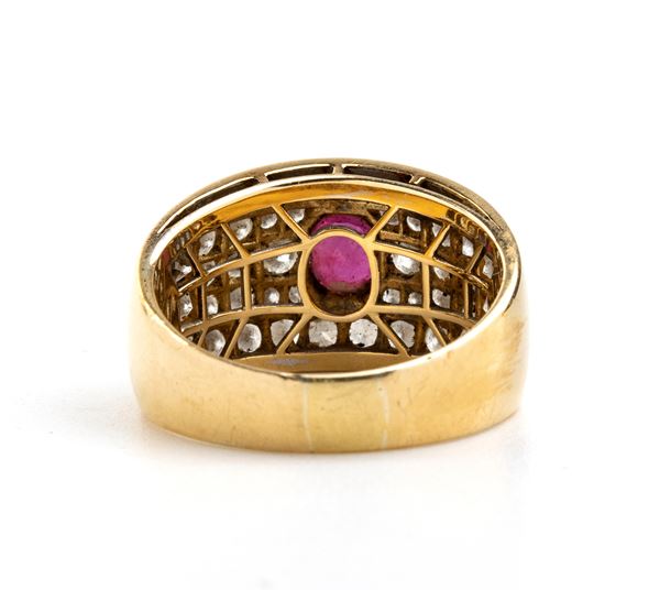 modellato come una fascia, incastonato con rubino contornato da pave' di diamanti.