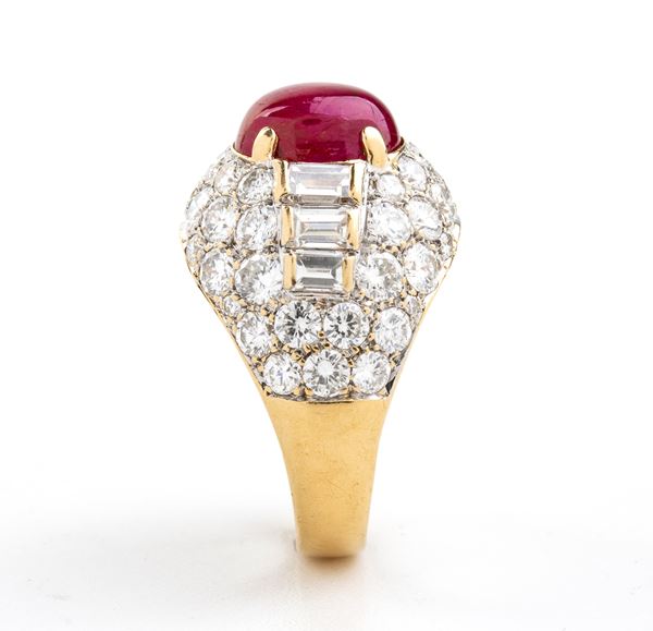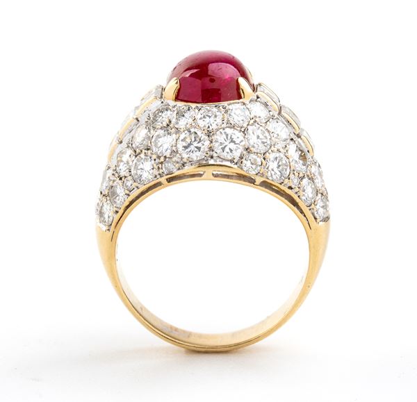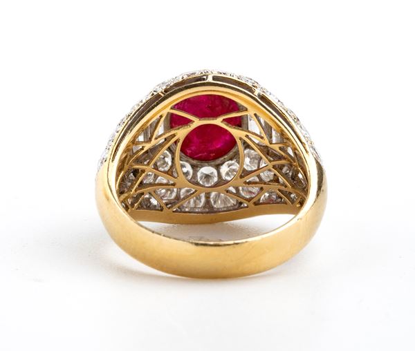 modellato come una fascia, incastonato con rubino contornato da diamanti.