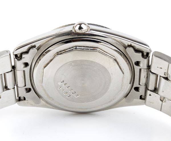 cassa e bracciale in acciaio, quadrante argentè, datario alle 3 e sfere a gladio. Movimento automatico. Ref. 1187, matricola 744920.