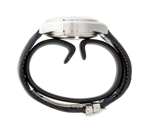 cassa in acciaio e cinturino in pelle con fibbia deployante in acciaio. Quadrante argenté con 3 contatori e datario ore 3. Carica automatica. Referenza MV045208, matricola 2960729, calibro ETA7750.