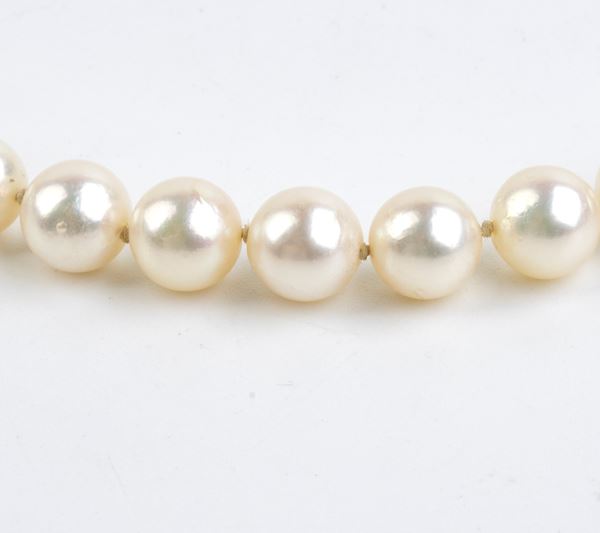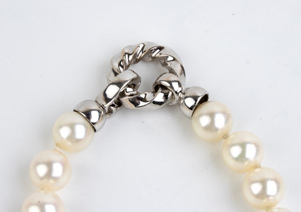 ad un filo di perle coltivate d'acqua salata, chiusura a moschettone in oro bianco 18k. Diametro perle 8,5 - 9 mm. Punzonata "750". Lunghezza 47 cm. Peso 44 gr.