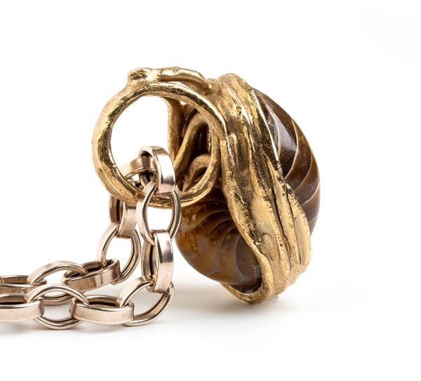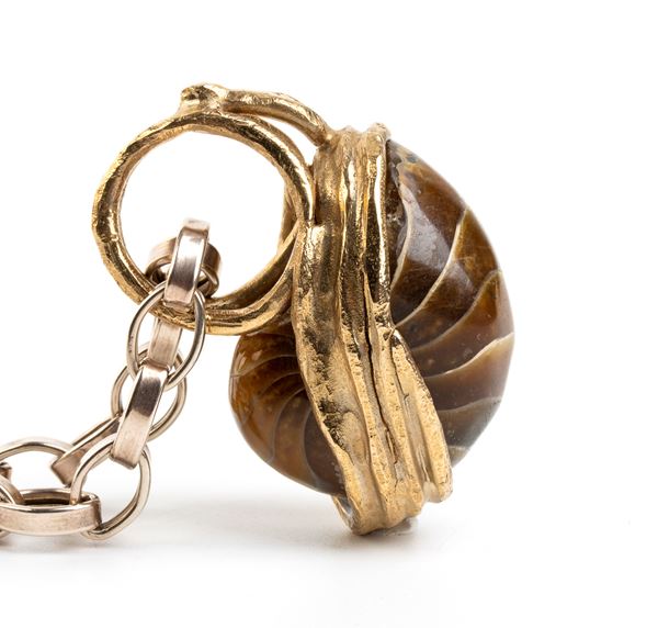catena a maglia rolo' in argento 925/1000 con un pendente in bronzo utilizzabile come anello, incastonato con fossile di cefalopode.