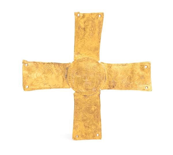 croce in stile archeologico inciso con figure geometriche e un volto centrale.