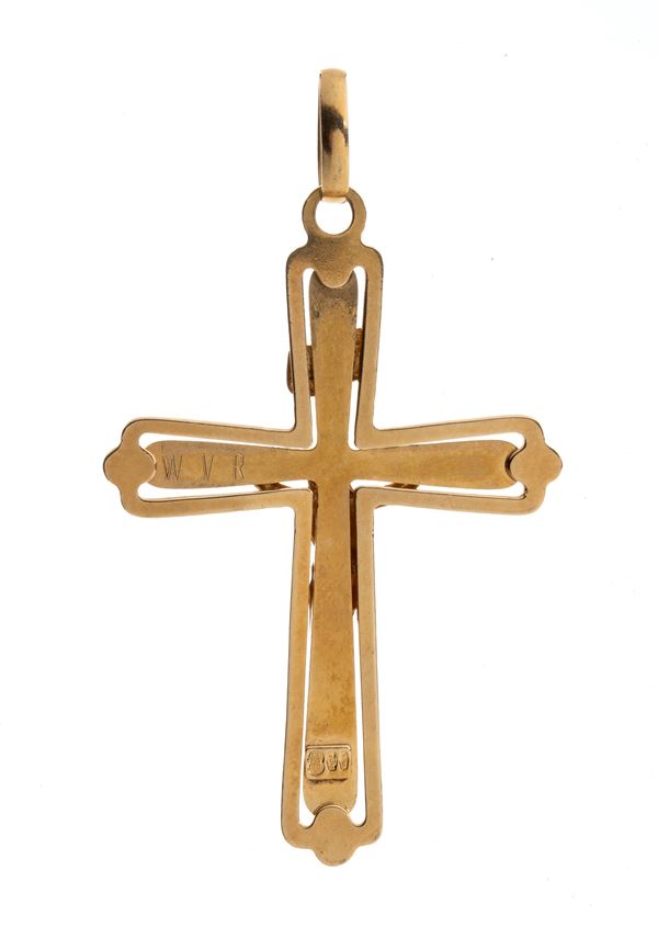 montatura in oro giallo 18k raffigurante Cristo crocifisso in una croce latina, con il cartiglio dell'iscrizione I.N.R.I. (Iesus Nazarenus Rex Iudaeorum, Gesù Nazareno Re dei Giudei) in alto.