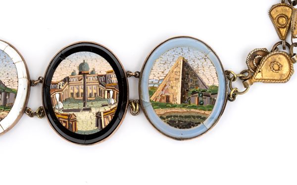 con 07 micromosaici raffiguranti monumenti della Roma classica e cristiana, catena a maglie geometriche con decori in filigrana.