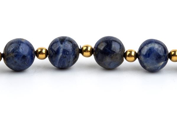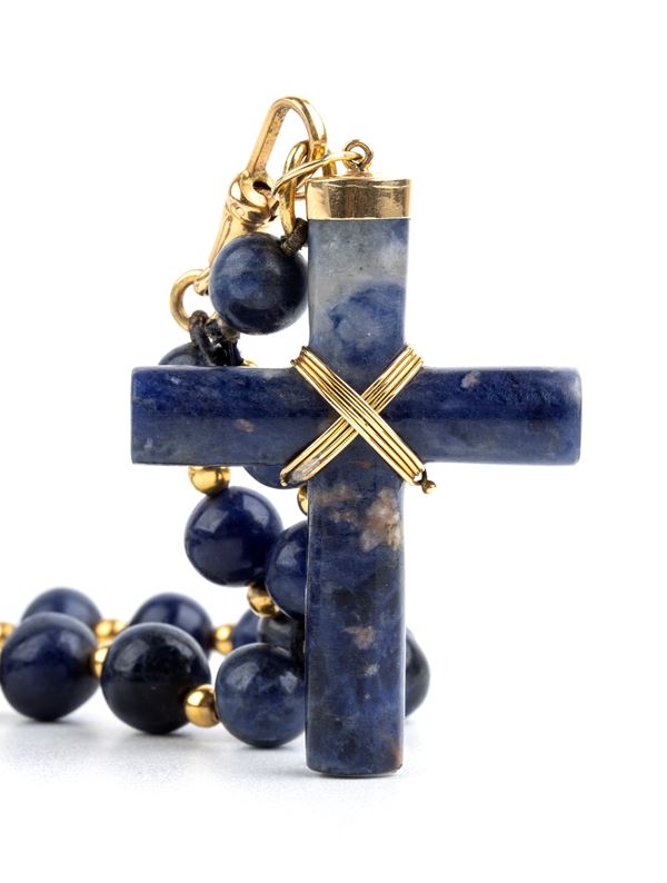 ad un filo di sfere di lapislazzuli a cui è sospeso un pendente a forma di croce in lapis, piccole sfere distanziali e dettagli sul pendente in oro giallo.
