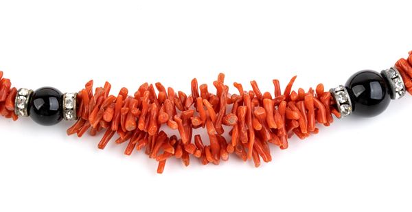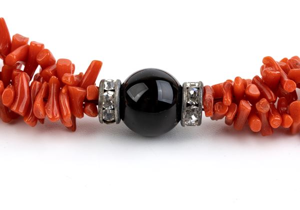 rametti di corallo Mediterraneo (corallium rubrum), sfere in onice, paste vitee ed argento.