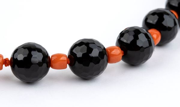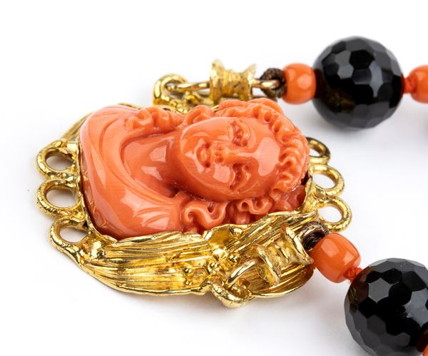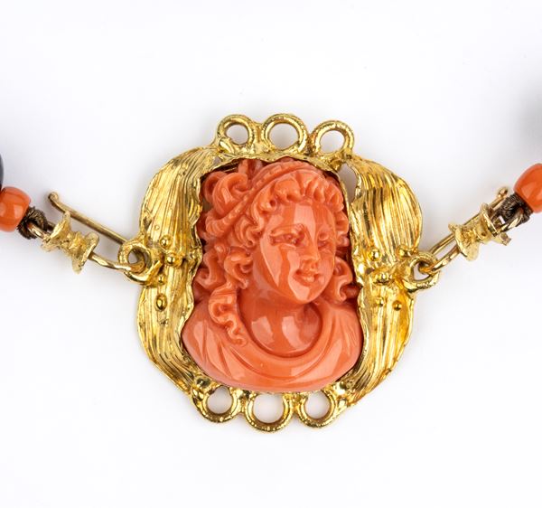 ad un filo di barilotti di corallo Mediterraneo (corallium rubrum), separati da sfere sfaccetate di onice; al centro della collana un cammeo in corallo cerasuolo (corallium elatius) raffigurante volto di donna, montaggio in oro giallo.