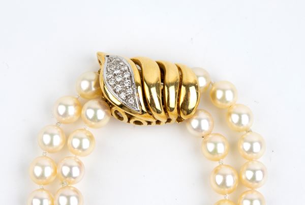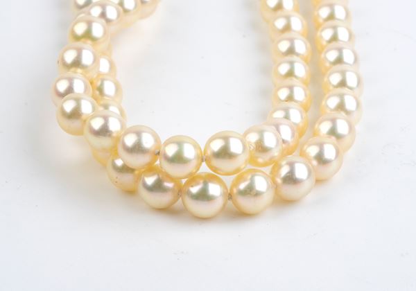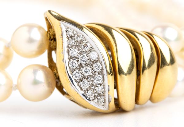 due fili di perle coltivate d'acqua salata, diametro 6,5 - 7 mm, chiusura traforata in oro giallo 18k impreziosita da diamanti.