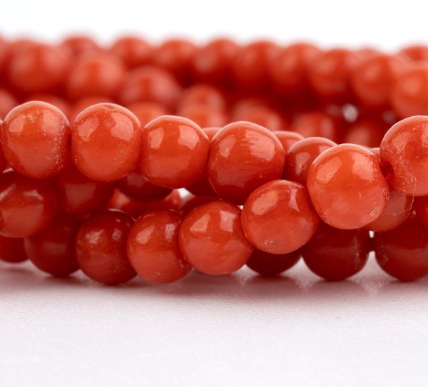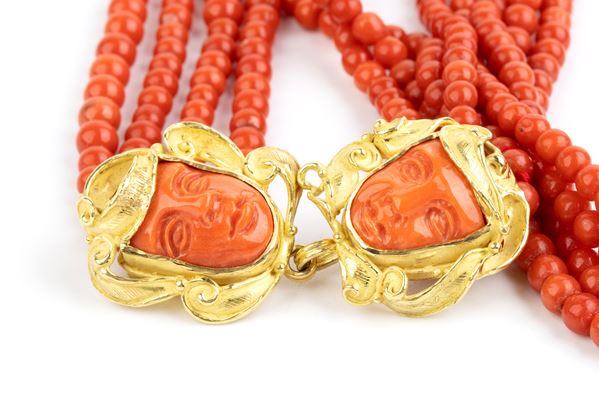 ad un filo di sfere di corallo Mediterraneo (corallium rubrum), fermezza in oro giallo incastonata con coppia di cammei in corallo, raffiguranti due volti.