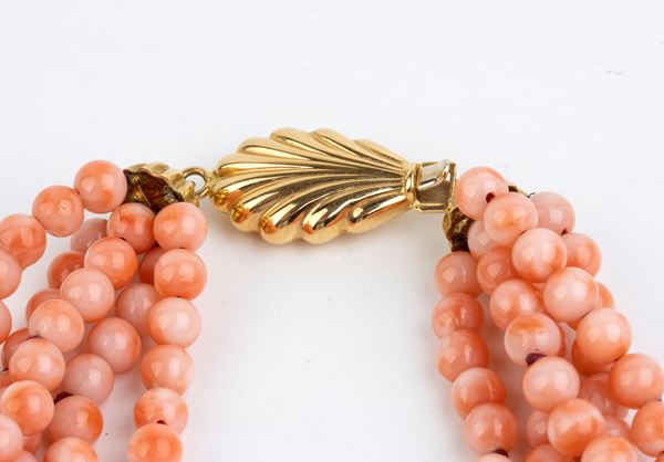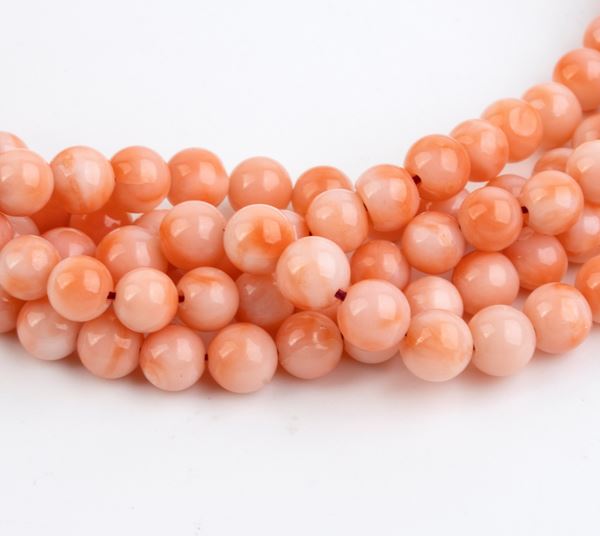 a 5 fili di sfere di corallo Deep Sea (corallium sp. nov.), fermezza in oro giallo 18k.