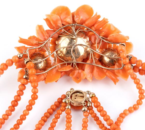 collana a tre fili di sfere e centrale decorato a motivi floreali in corallo Mediterraneo. montatura in oro.