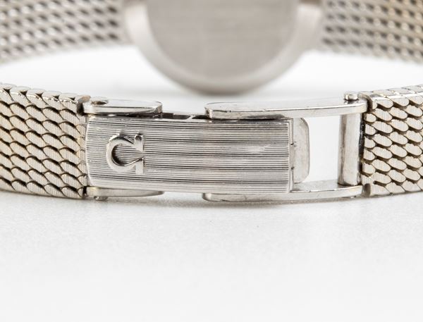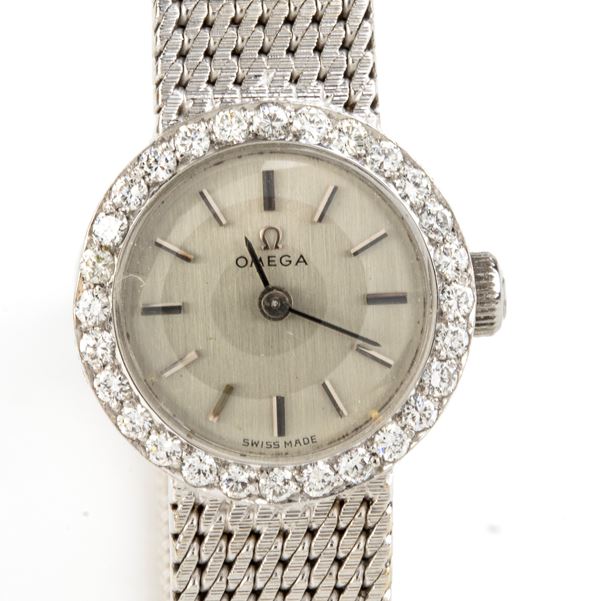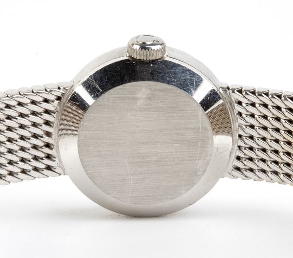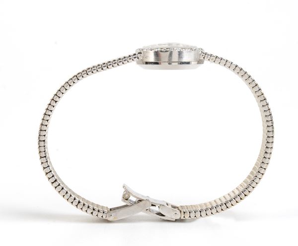cassa in oro bianco 18k con quadrante argenté con indici a bastone, contornato da diamanti. Movimento meccanico a carica manuale.