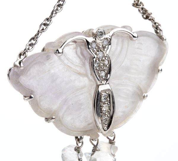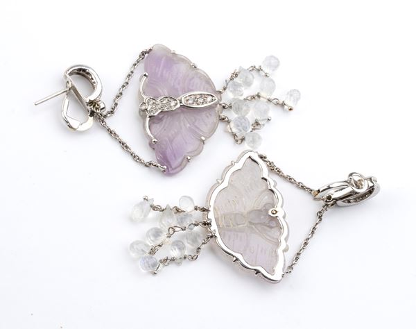 in oro bianco 18k, impreziositi da diamanti, gocce di labradorite e lavanda intagliata nella forma di una farfalla.