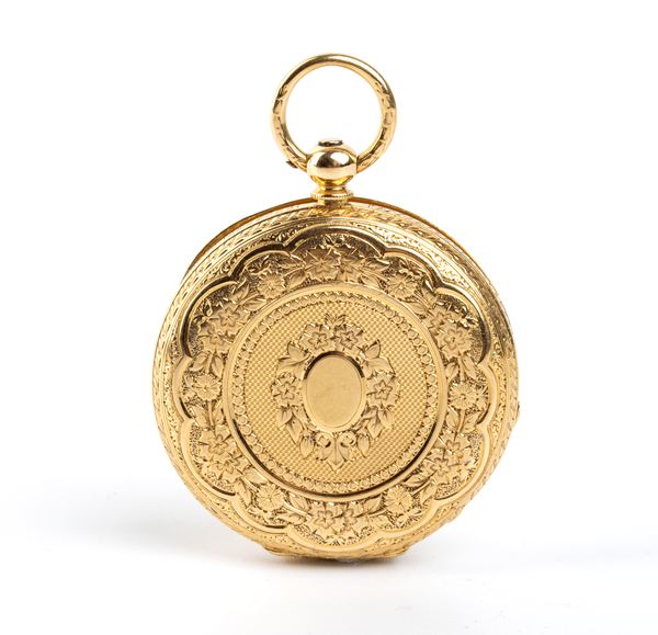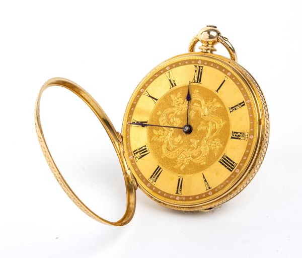 cassa anonima in oro giallo 18k con meccanismo a cilindro completo di chiave di ricarica, quadrante finemente lavorato con indici romani e sfere nere.