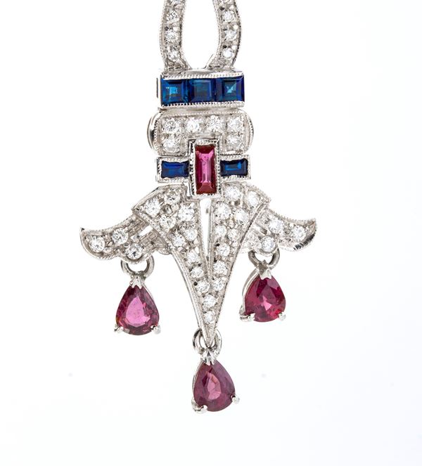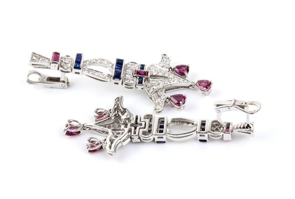 Paio di orecchini pendenti in oro con diamanti, zaffiri e rubini