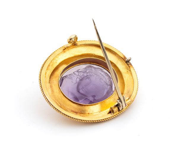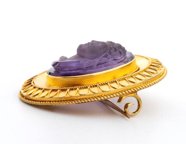 spilla in oro giallo di forma ovale, decorata con motivi a filigrana e cordonetto, incastonata con cammeo in ametista raffigurante il volto di una donna.