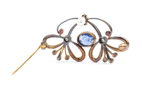 Spilla in oro con perle, diamanti e zaffiri, Inizio XX secolo