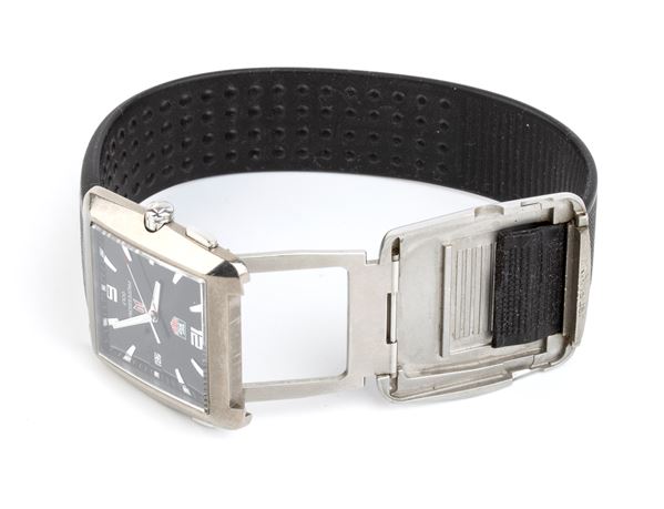 cassa in acciaio di forma quadrata con fibbia deployante incorporata, cinturino in gomma. Quadrante nero con indici a sfere argentate e datario ore 3. Movimento al quarzo.