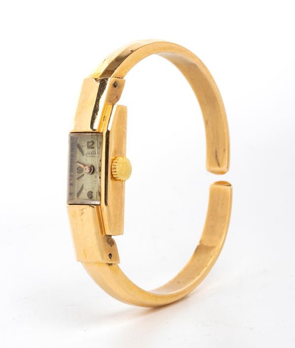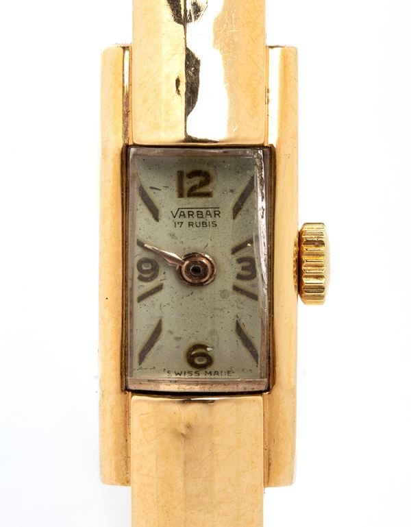 cassa e bracciale a molla in oro giallo 18k, quadrante argenté con scritta "Varbar - 17 Rubis - Swiss made", indici arabi e dritti dorati.
