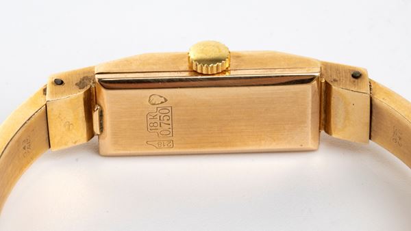 Punzonato "750 - 18K - 218 - EG". Dimensioni cassa 3,3 x 1 cm. Circonferenza 4,5 x 3,5 cm.