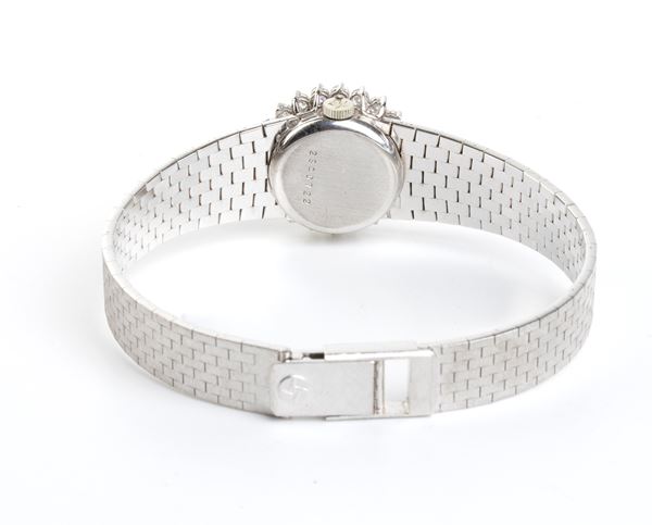 cassa in oro bianco 18K con e bracciale integrato commerciale con movimento meccanico a carica manuale.