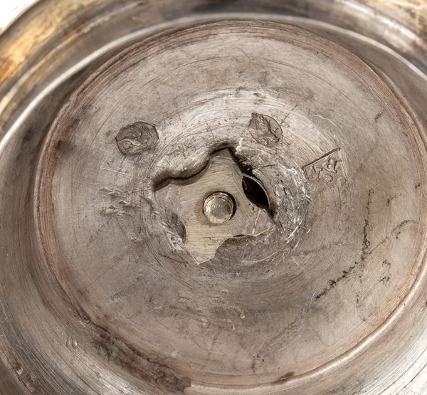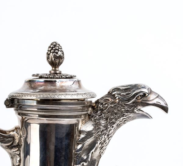 corpo ovoidale liscio poggiante su tre piedini con estremità a zoccolo e attaccatura superiore a foglie d'alloro; beccuccio a testa di rapace, coperchio incernierato con presa a pigna, manico ad ansa in ebano. Argento 950/1000, punzonata con i marchi per l'argento al primo titolo in uso a Parigi dal 1798 al 1809, con il marchio non ufficiale utilizzato dall'Association des Orfévres di Parigi per l'argento al primo titolo di 950/1000 "testa di cinghiale" e con le iniziali J.N.B.dell'argentiere Jean-Nicolas Boulanger.