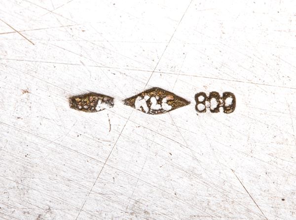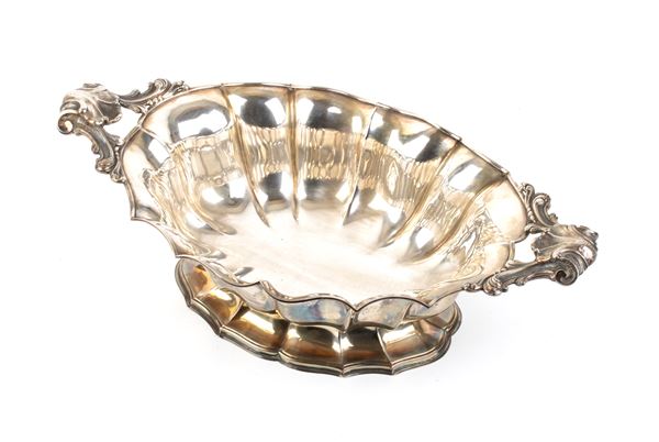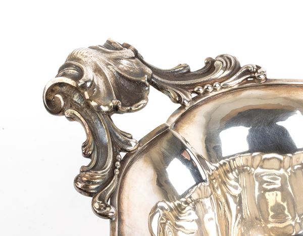 di forma sagomata con manici decorati con motivi di foglie. Argento 800/1000, punzonato "800".