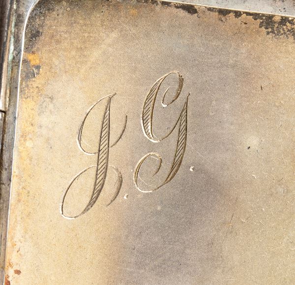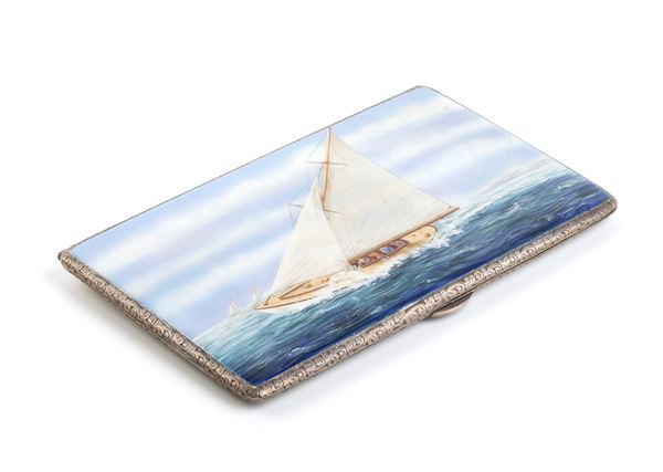 Portasigarette Art Déco inglese Slipway in argento e smalti policromi, Birmingham 1935-1936