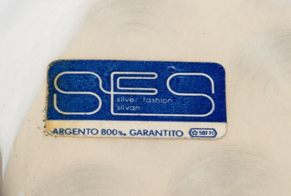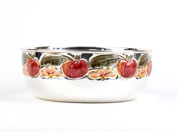 di forma circolare a smaltata in policromia con motiivi di frutti e fiori. Argento 800/1000, punzonato "800 - 597 FI", argentiere Silver Fascion Silvan di Landi Annita in Poggioli.