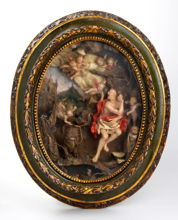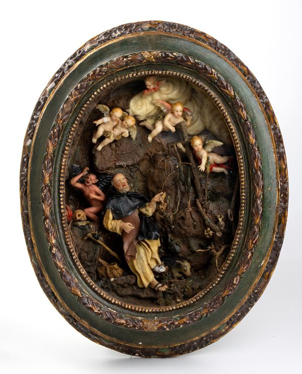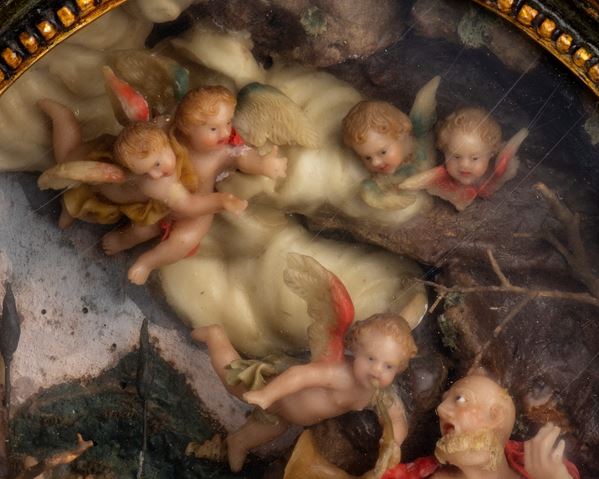 due composizioni in cera policroma raffiguranti scene religiose, entro cornici ovali in legno intagliato, laccato e dorato.